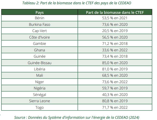 La biomasse, en particulier le bois de chauffage et le charbon de bois, demeure la principale source d’énergie pour une grande partie des 400 millions d’habitants de la CEDEAO. En 2021, elle représentait une part significative de la consommation finale d’énergie dans la région, atteignant 62,6 % en 2019 selon les données. Dans certains pays, comme le Burkina Faso, cette proportion dépasse les 70 %, témoignant de l’importance de la biomasse pour les besoins énergétiques domestiques et productifs. Malgré son rôle crucial, l’utilisation de la biomasse pose des défis environnementaux et de santé publique. La pression sur les ressources forestières alimente la déforestation, tandis que l’exposition prolongée aux fumées issues de la combustion affecte la santé des populations, notamment des femmes et des enfants. Aussi il y a le Rendement énergétique faible. En effet, la chaîne de valeur de la biomasse reste inefficace, avec des pertes considérables entre la production, la transformation et la consommation. En réponse, la CEDEAO, dans le cadre de sa Politique énergétique actualisée adoptée en 2023, a fixé des objectifs ambitieux de substitution de la biomasse par des énergies modernes et propres, comme le GPL, le biogaz et l’électricité.